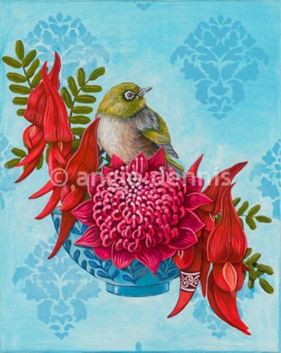 Established Auckland artist Angie Dennis has been painting professionally since 2002. Angie studied environmental science which perhaps explains her love for preserving flora and fauna in her artworks. Angie is continually inspired by the unique landscape of New Zealand and is constantly pushing boundaries on how she sees life in her new found home. Her work is displayed in collections throughout New Zealand and internationally and were also displayed on the TVNZ set for the 2007 America’s cup. Angie exhibits in a number of galleries around New Zealand and also combines home with gallery where she creates her unique and original artwork. Angie’s prints are produced to the highest quality, using UV light fast inks and printed and framed in New Zealand.